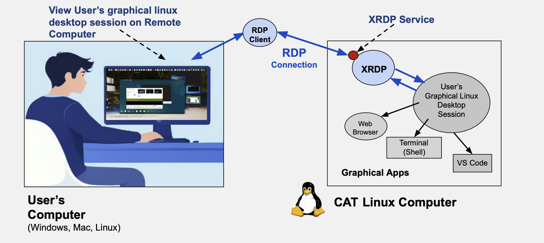Most user-facing Linux systems managed by the CAT run the Xrdp service. The Xrdp service enables programs (clients) that support Microsoft’s Remote Desktop Protocol (RDP) to establish a graphical session with these Linux systems.