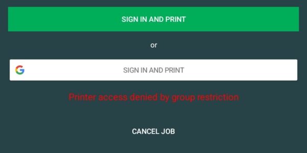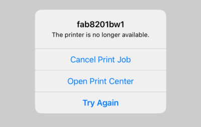 Mobility Print will ask you to login with your MCECS credentials the first time you try to use a new printer. Please note that this tends to fail on the first attempt but work on the second. After you have signed into a printer, it will remember the credentials indefinitely. If you see the following popup after sending a print job, it likely means that you do not have access to that printer. Choose a different printer and try again.