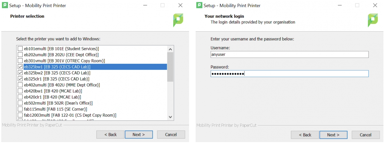 Run the Mobility Print installer and then choose which printer to install. Enter your MCECS login credentials and then the printers will be added to your computer.